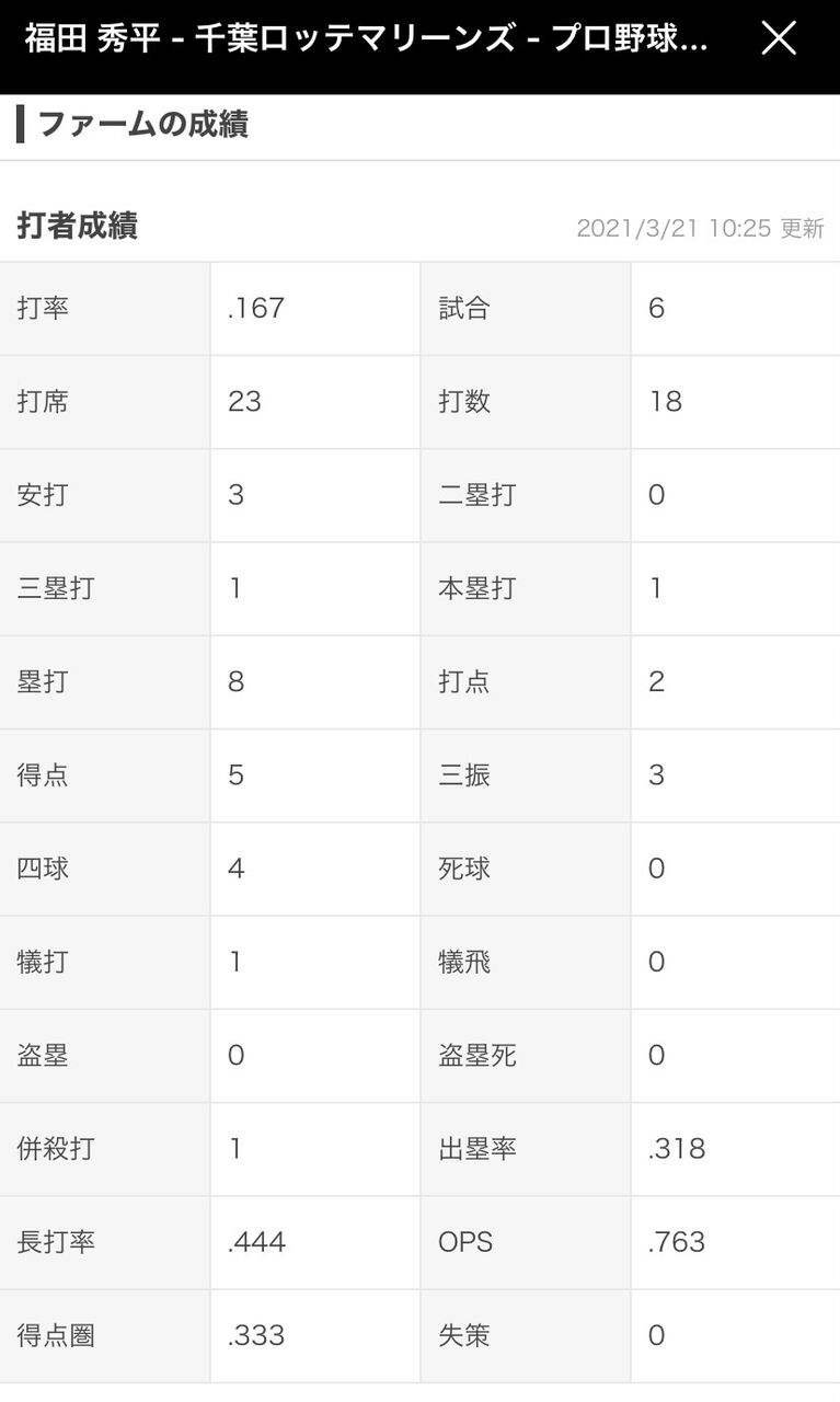 ロッテ福田秀平&井上のファーム成績