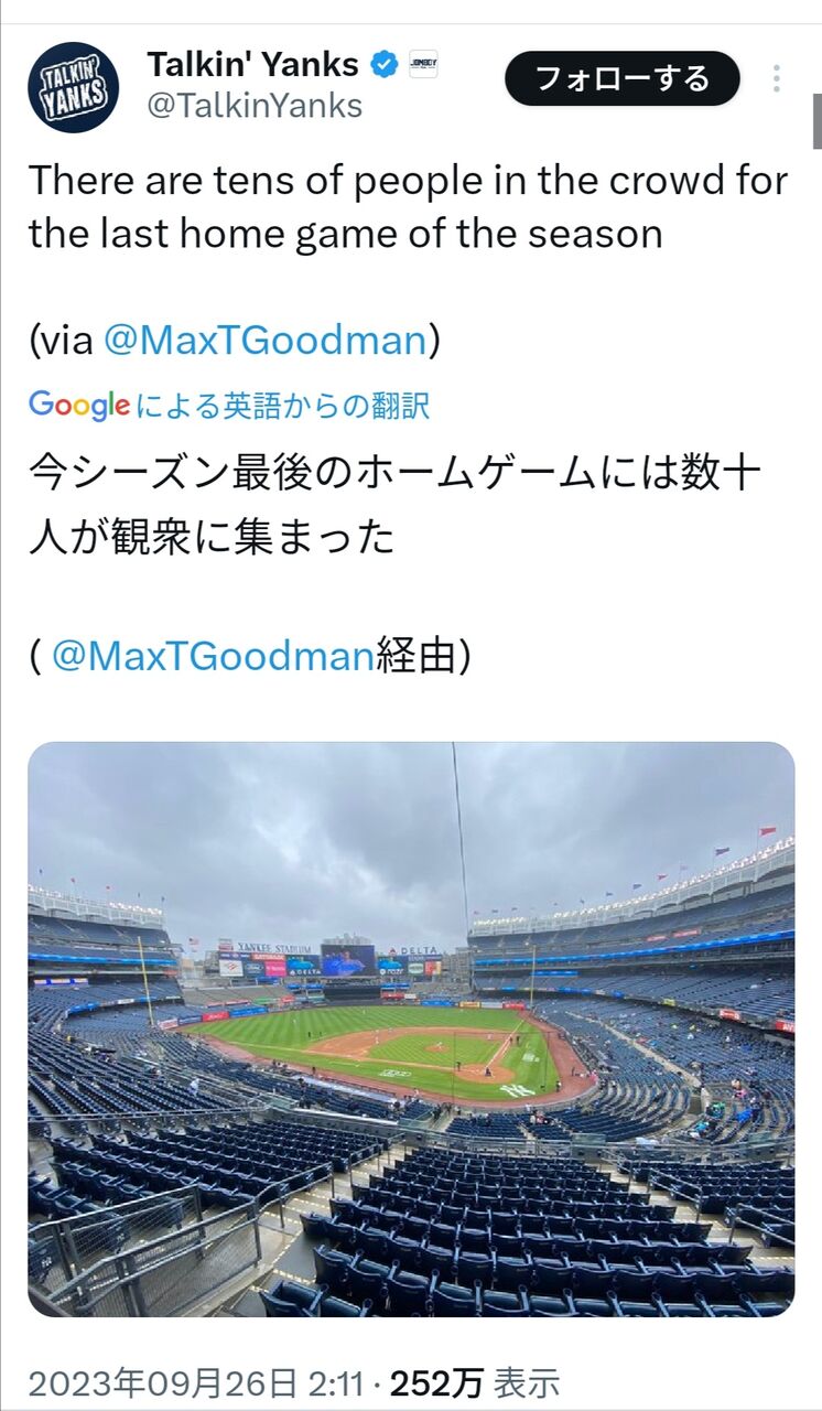 【悲報】MLBニューヨーク・ヤンキースさん、シーズン最終ホーム戦の観客数がこちら………………