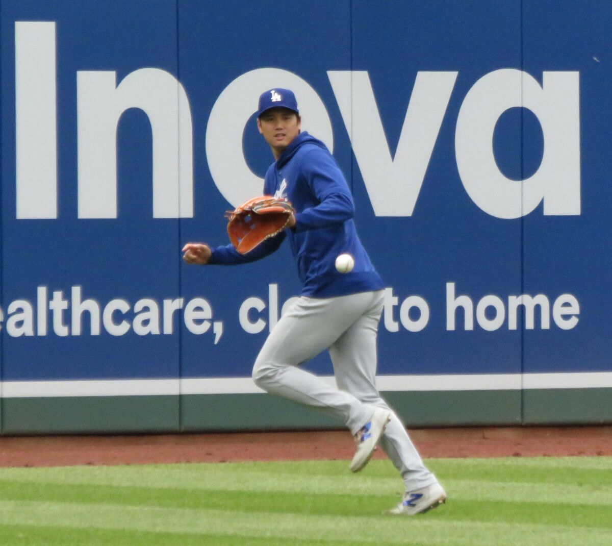 「2番・DH」で先発出場する敵地ナショナルズ戦の試合前だった。術後14度目のキャッチボールでは外野用グラブを使い、最長で約20メートルの距離から57球を投じた。投手としてのリハビリを終えると、三塁ベンチ裏に引き揚げると思われたが、自らの意思で左翼の守備位置付近にとどまった。