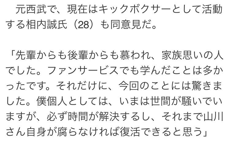 「先輩からも後輩からも慕われ、家族思いの人でした。ファンサービスでも学んだことは多かったです。それだけに、今回のことには驚きました。僕個人としては、いまは世間が騒いでいますが、必ず時間が解決するし、それまで山川さん自身が腐らなければ復活できると思う」