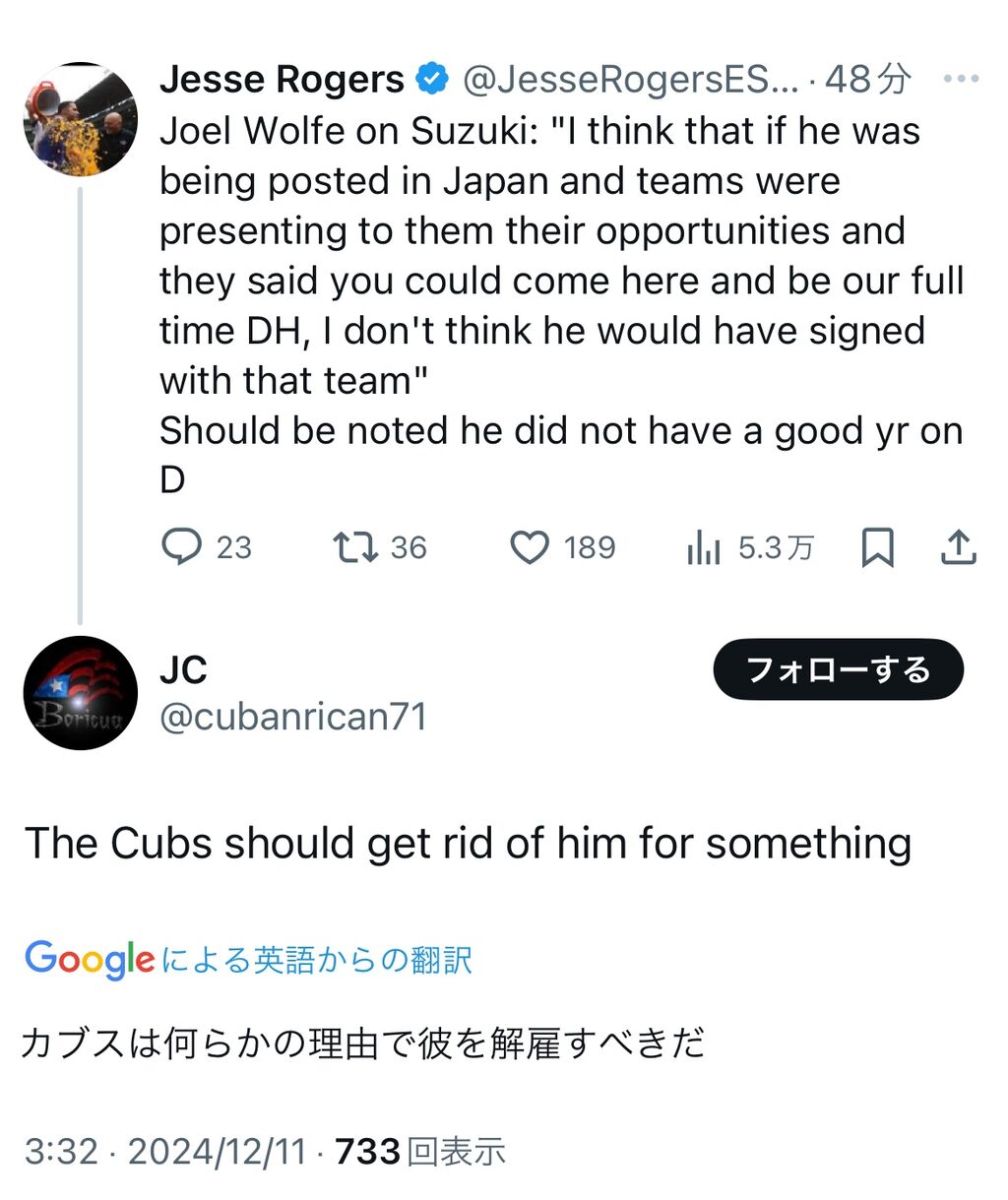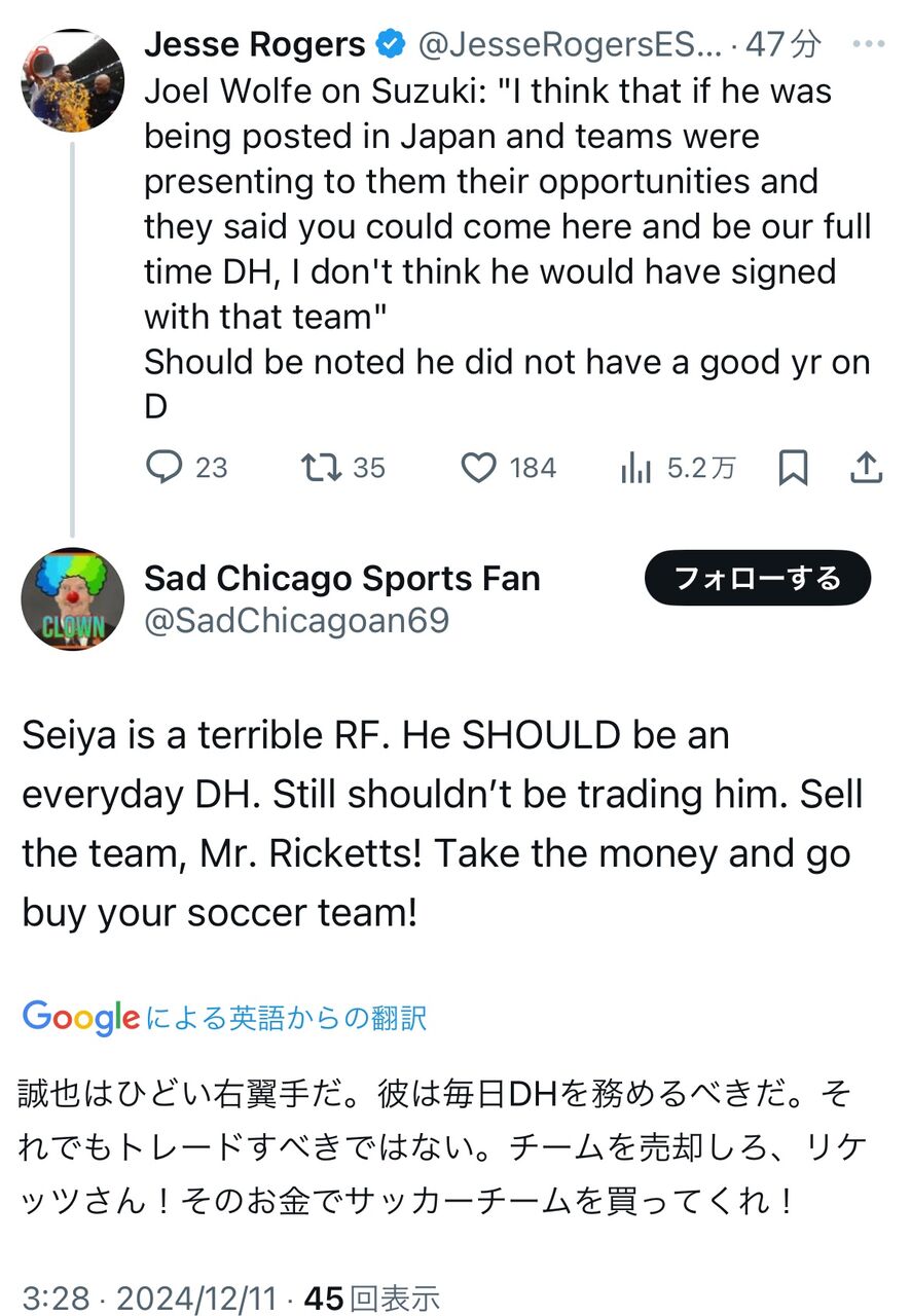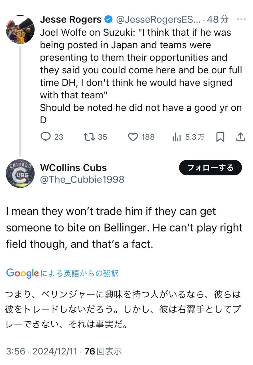 カブスの守備が優れてるのも一因やから、普通にライト足りなくて困ってるチームからはぜひうちに来て下さいって言われる可能性はあるよな