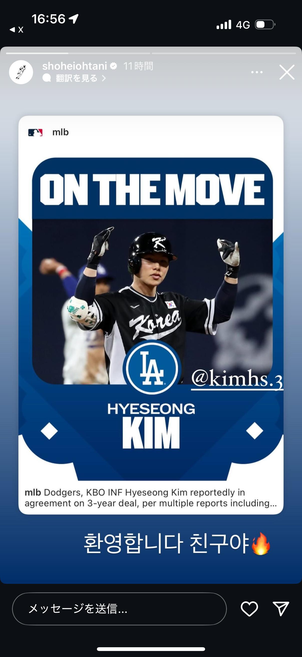 ドジャース、韓国25歳内野手キム・ヘソンと3年20億円合意 正式発表 俊足巧打 大谷翔平もSNSで歓迎「ようこそ」https://news.yahoo.co.jp/articles/a9f09a03063ca402fa7913d1652911a556e710aa