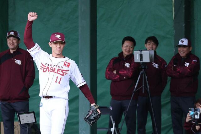 楽天辰己涼介外野手(28)が7日、沖縄・金武のキャンプでブルペン入りした。岸の背番号11のユニホームを着て、三木谷オーナー、石井GMも見る中で計7球。最速は152キロだった。
