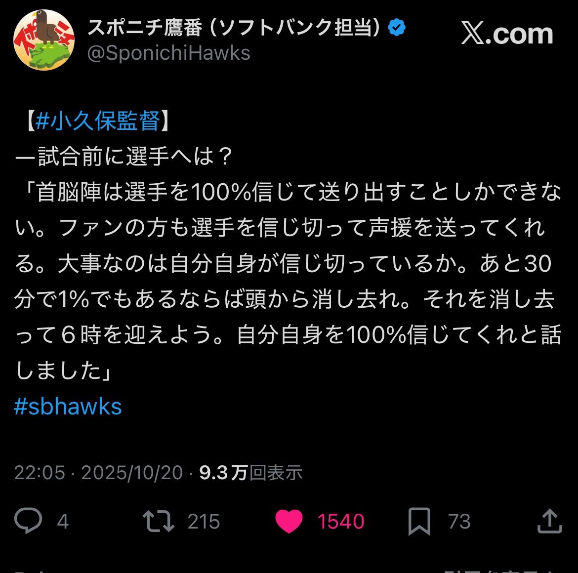 あの中田翔が小久保やなかったら代表辞退してたかも言うてこの人を絶対胴上げしたい言うてたぐらいやからね