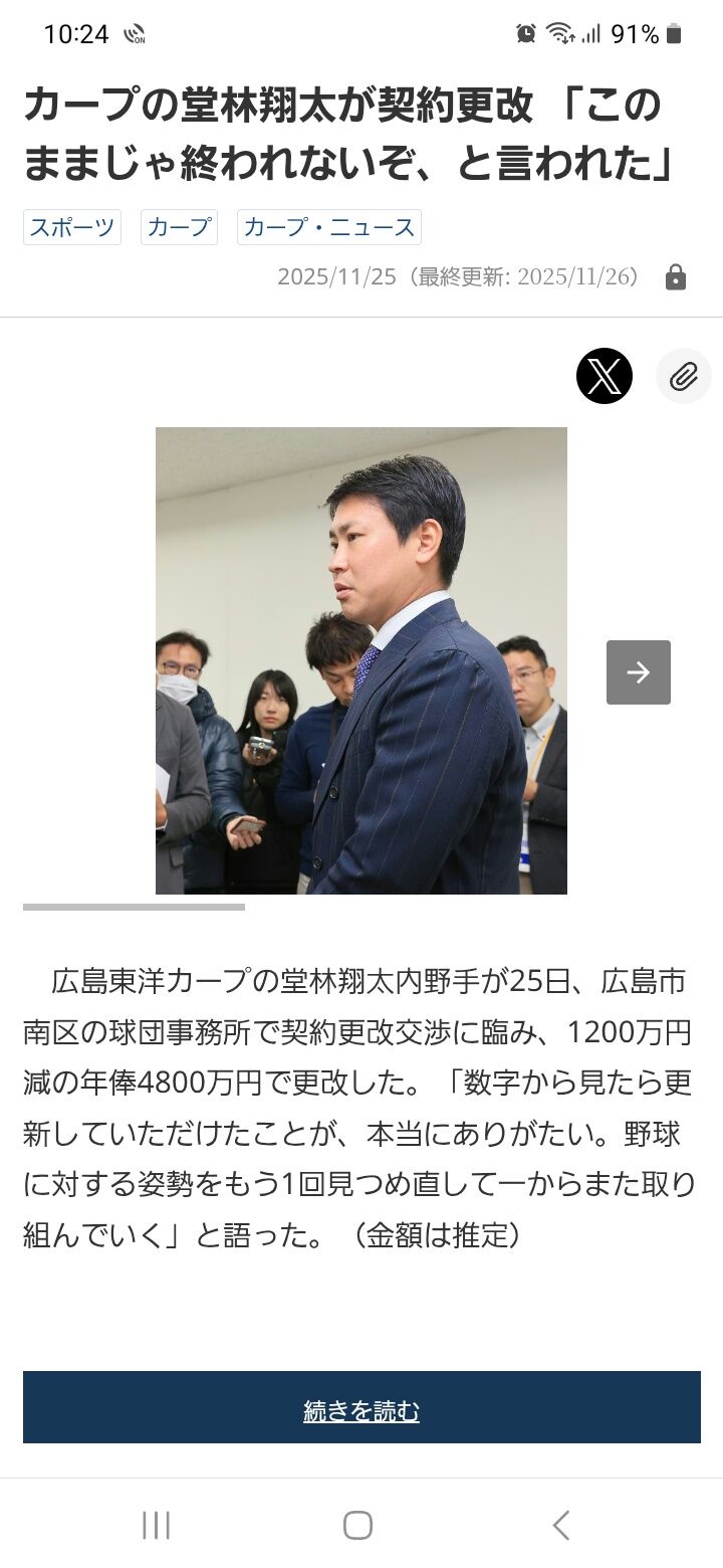 広島・堂林(34) 6000万円→4800万円 2025年11月30日 カテゴリ:広島東洋カープ 1: Red★速報 2025/11/25(火) 11:06:49.14 ID:lUuL46oD0 22年 274打席 .243 8 28 ops.679 3600→5000 23年 284打席 .273 12 35 ops.784 5000→6400 24年 273打席 .230 1 17 ops.572 6400→6000 25年 77打席 .186 1 4 ops.564 6000→4800 【広島・堂林(34) 6000万円→4800万円】の続きを読む タグ :#野球#広島東洋カープ#堂林翔太